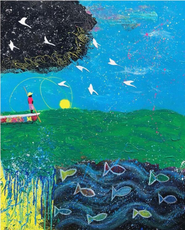Granper is a tender and profound homage to the elders, the anchors of our heritage. The small boat, cradled by the water, becomes a powerful symbol of life’s journey and the sacred passage of wisdom from one generation to the next. Under a sky alive with birds and above a sea teeming with fish, the grandfather sits as a guardian, embodying the eternal and sacred bond between the earth, the sea, and collective memory. This artwork is a poignant evocation of continuity—a quiet celebration of heritage, resilience, and the profound, guiding wisdom of those who came before us.