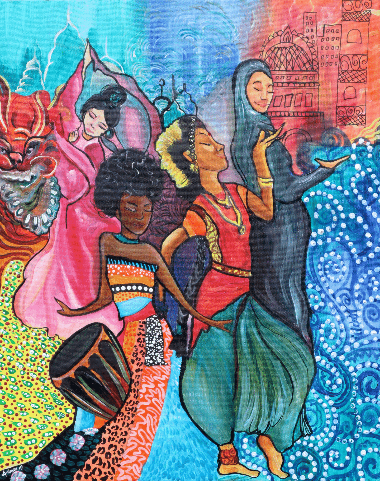 This vibrant artwork is an ode to cultural diversity and the dialogue of civilizations. Female figures from different traditions join together in a universal dance, symbolizing harmony and sharing. The vivid colors, decorative motifs, and richness of details create a festive and spiritual atmosphere, where each culture contributes its voice to a shared symphony.