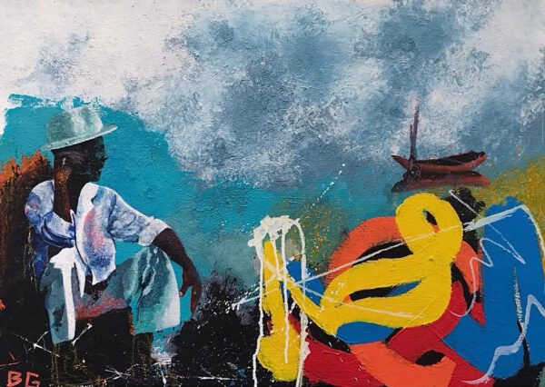 Vey lamare captures a moment of calm and contemplation. The fisherman, resting by the shore, gazes at the horizon as sea and sky merge in silent harmony. The painting reflects the intimate relationship between man and the ocean, built on patience, respect, and serenity.